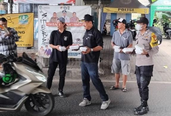 Sebanyak 100 nasi kotak dibagikan kepada warga dan pengguna jalan yang melintas di Bundaran JORR Jatiwarna.