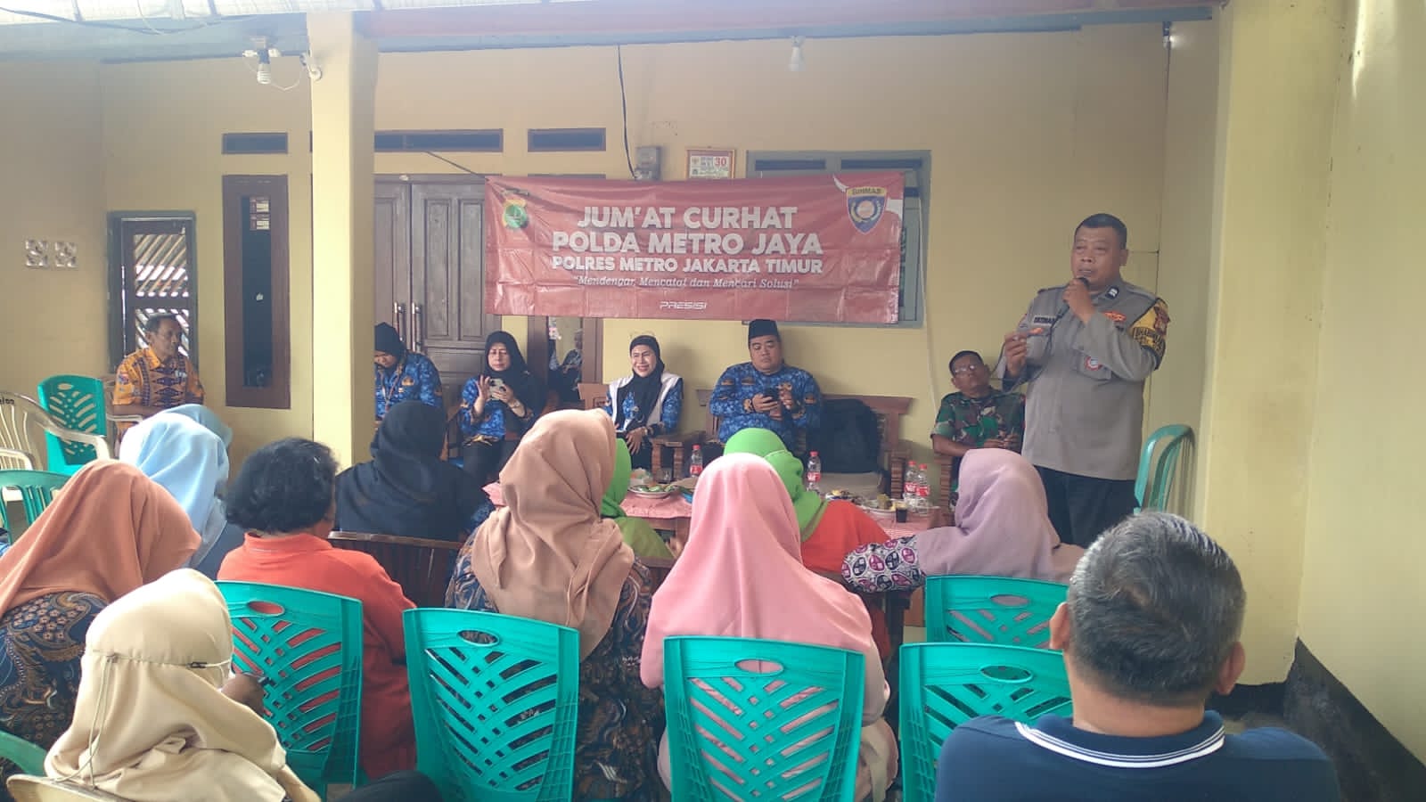 “Program Jumat Curhat merupakan salah satu upaya pembinaan kemitraan Polsek Ciracas Polres Metro Jakarta Timur dengan masyarakat, dimana Polri dapat berinteraksi secara langsung dengan masyarakat untuk mendengarkan saran, kritikan, masukan serta aduan masyarakat terkait dengan pelayanan Kepolisian,” ungkap Bhabinkamtibmas Kel. Susukan Aiptu Yatman.