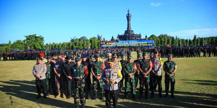 TNI dan Polri menggelar apel gelar pasukan terkait pengamanan event Konfrensi Tingkat Tinggi (KTT) World Water Forum (WWF) ke-10 di Bali pada 18-25 Mei 2024. Apel gelar pasukan digelar di Lapangan Niti Mandala Renon hari ini, Rabu (15/5/2024).