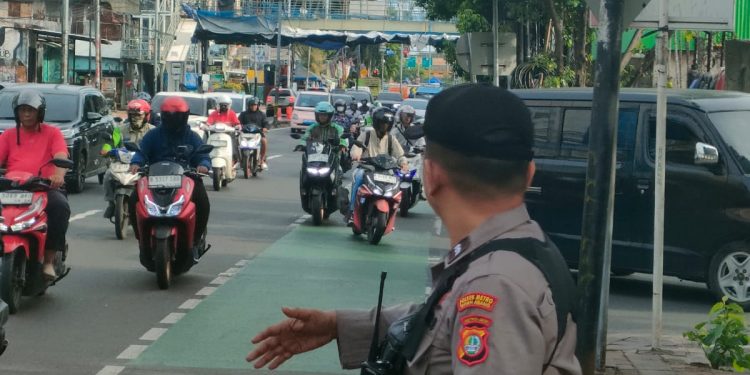 Jakarta Pusat – Patroli 1051 Unit Samapta Polsek Metro Tanah Abang Aipda Alfian dan Brigadir Marudut melaksanakan kegiatan pengaturan arus lalu lintas pagi hari di Pertigaan Kebon Kacang Raya, Kebon Kacang, Tanah Abang, Jakarta Pusat, Kamis (6/11/2025).