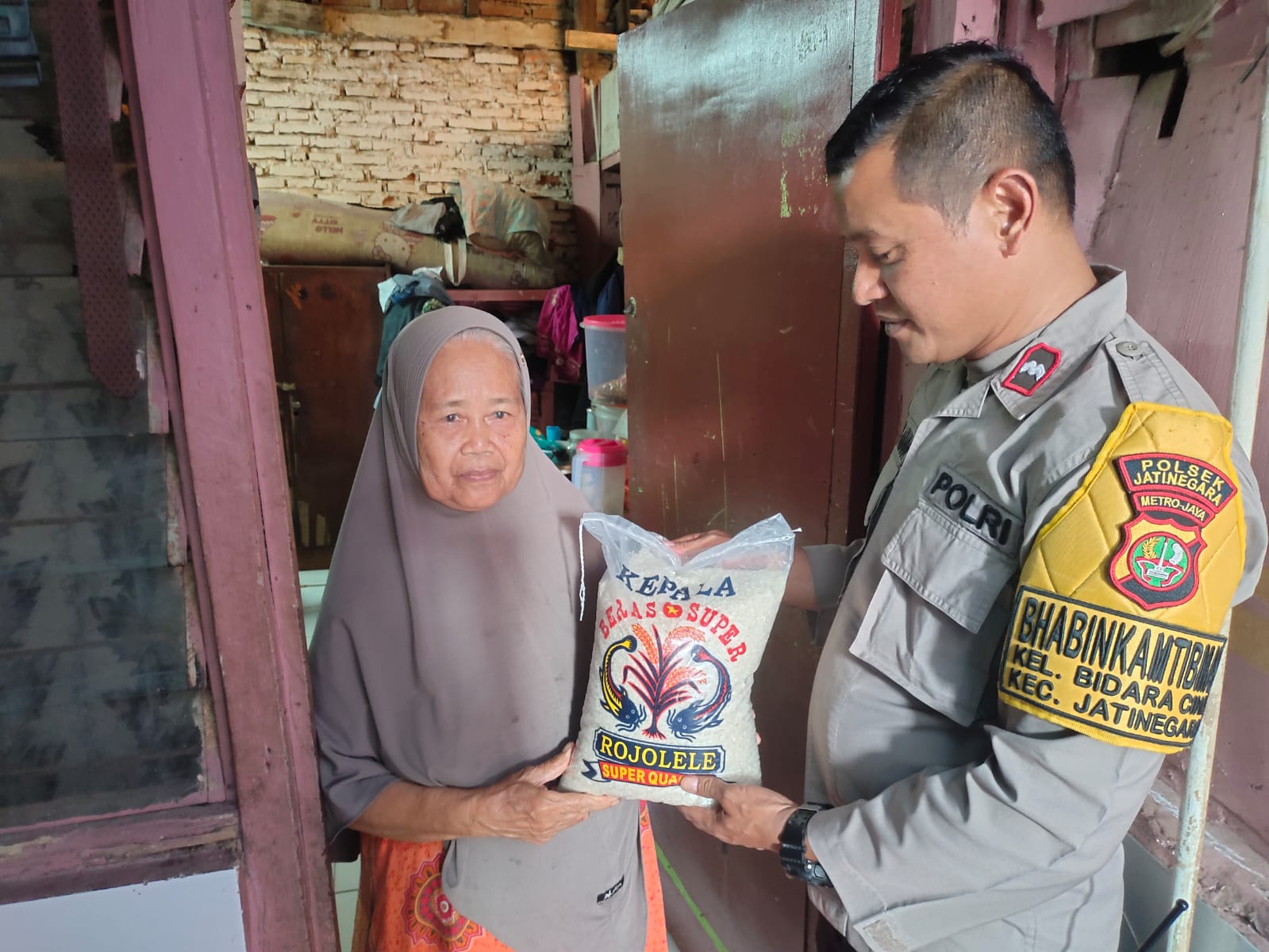 Bhabinkamtibmas Bidaracina Aipda Andri Ariana memberikan bantuan sembako (beras) kepada 3 warga kurang mampu di RW 15 dan RW 003 Kel. Bidaracina Kec. Jatinegara Jakarta Timur. Rabu (15/5/2024)